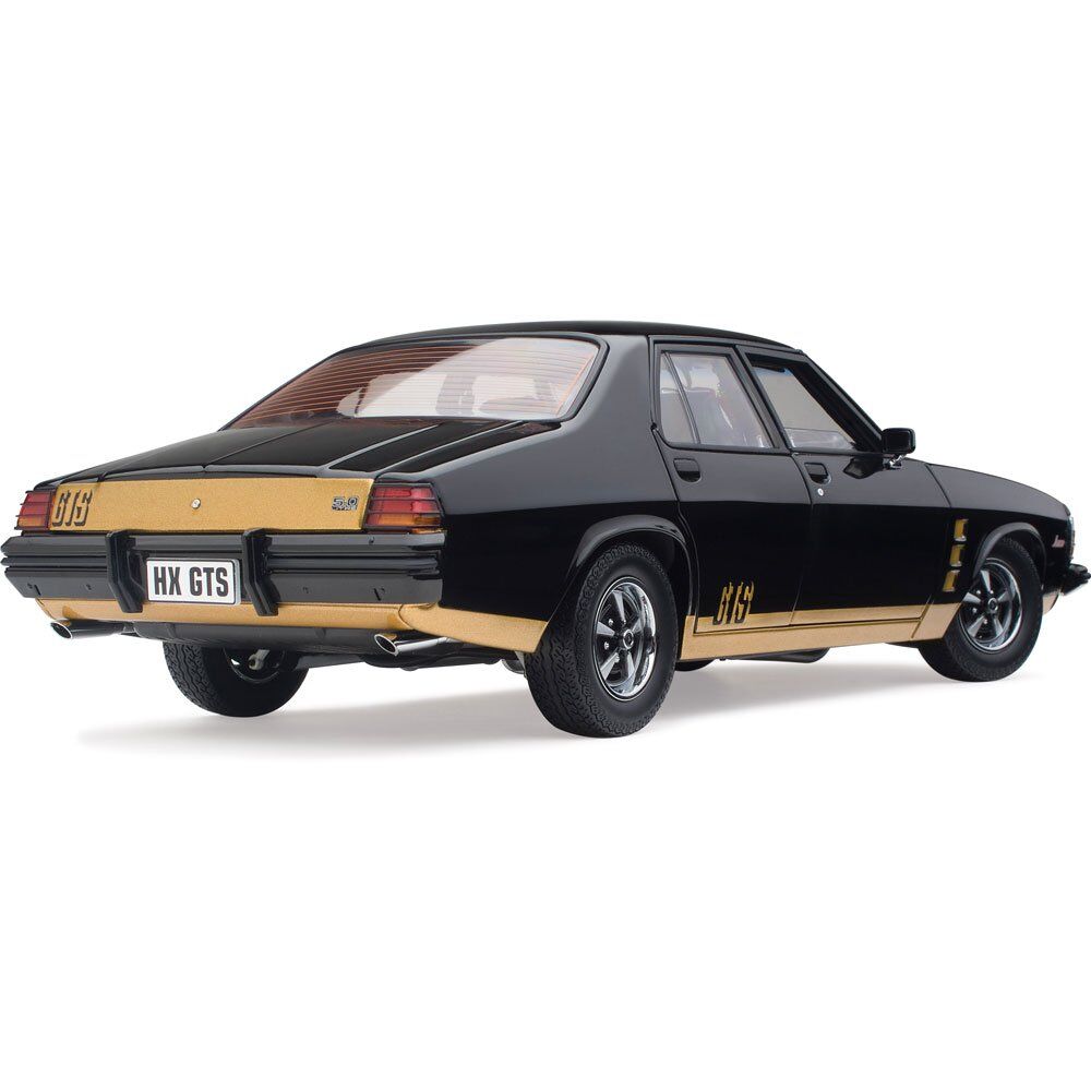 This 1/18 scale replica model is represented in the Tuxedo Black colour scheme. This sleek, deep black finish contributed to the vehicle's distinctive and bold appearance, enhancing its muscular design and complementing features like the refined grille and prominent GTS decals, including special "Gold-outs" instead of the standard "Black-outs" exclusive to the Tuxedo Black models. The HX series offered a range of vibrant colours, with Tuxedo Black standing out as a classic choice among enthusiasts.