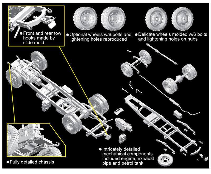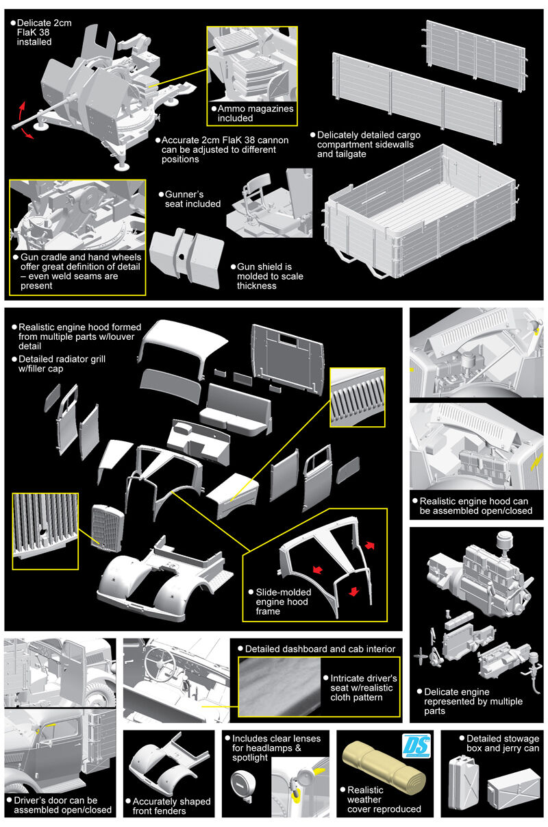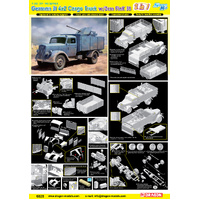 Dragon has done a remarkable job in developing this 1/35 scale kit of the 3t 4x2 truck. It...s made even more attractive by the fact that it...s a 2-in-1 kit, with modelers having the option of assembling a regular cargo truck, or one mounting a 2cm FlaK 38 cannon in the rear cargo bed. All the parts for this antiaircraft cannon are included in the box, and the weapon can be adjusted to depict different firing positions. Further options come from the fact that the cab doors, engine hoods and tailgate can be assembled open. There is even a fully detailed engine as well. This was a popular truck in German service, and this kit will be just as much in demand thanks to its versatility and accuracy.