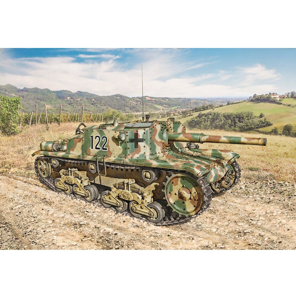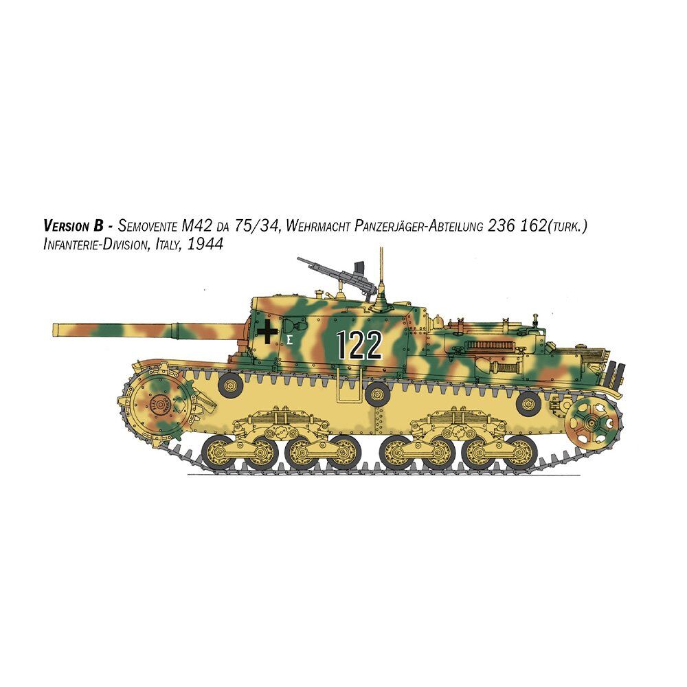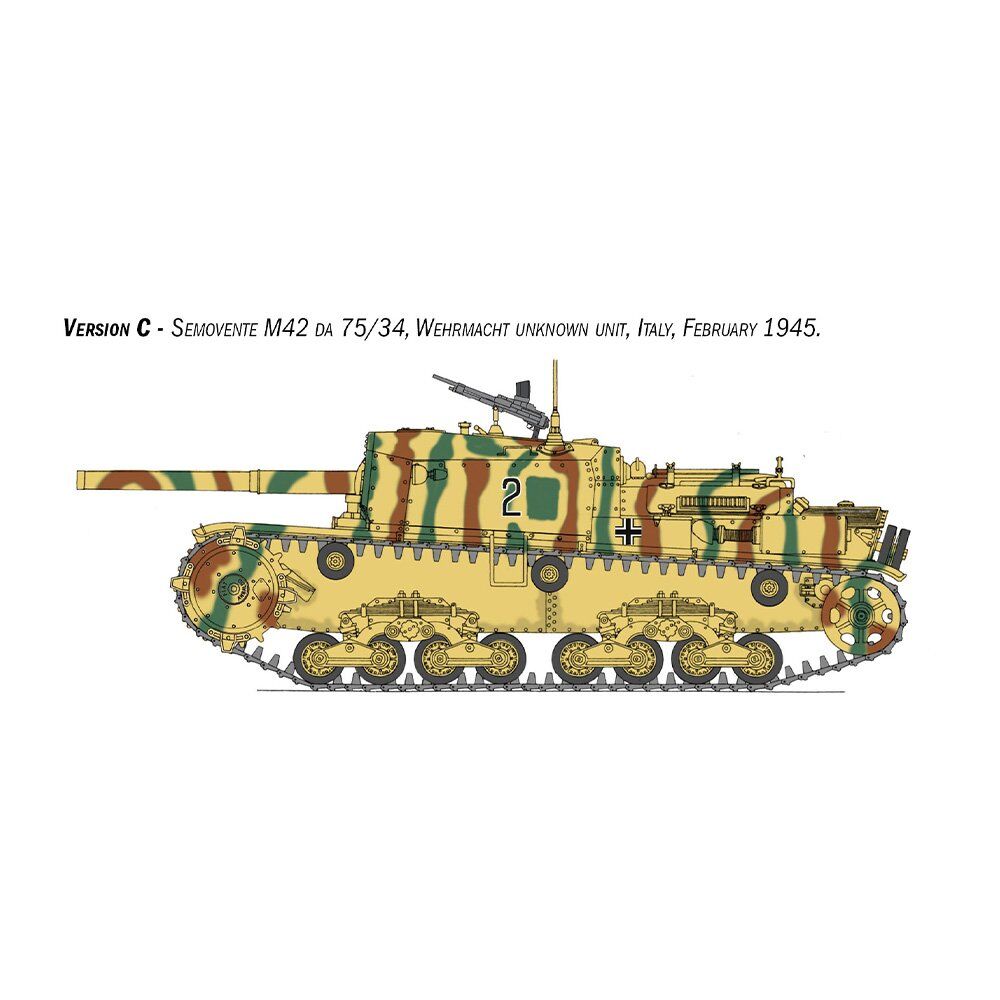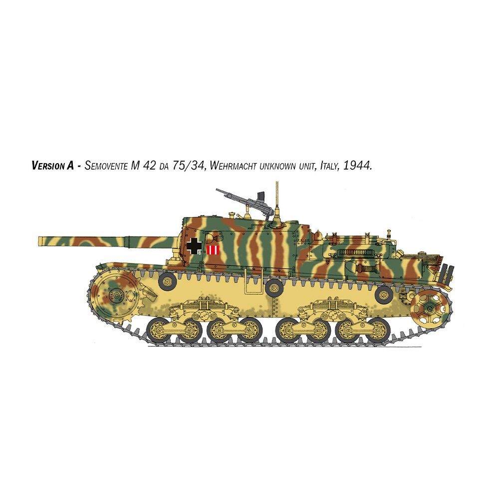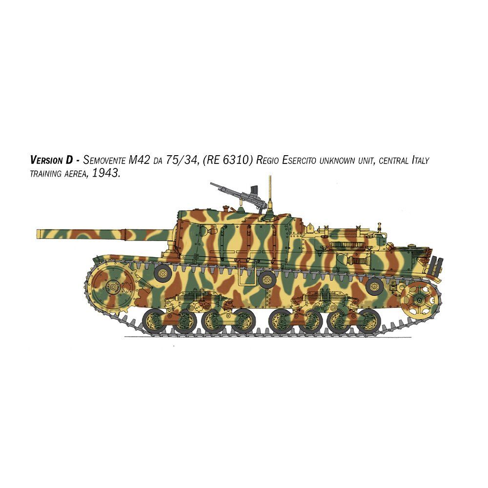 At the end of the 1930’s the Italian Regio Esercito (Royal Italian Army) began to deploy self-propelled artillery guns to provide support for tanks and infantry units. The ‘Semovente’ 75/18 was developed on the back of the ‘M’ series medium tank hull and soon became the most feared Italian armored vehicle. In addition to its primary artillery role, the 75mm howitzer installed in the casemate proved to be a highly effective anti-tank weapon, capable of destroying even the most powerful and heavily armored British and American tanks. During the war however, the Italian Regio Esercito requested the development of a version with increased offensive capability. The 75/34 cannon which was originally designed for an anti-tank role, was fitted to the hull of the M42 self-propelled tank. The initial units of which, were distributed to the Italian Army in the spring of 1943. As a result of its effective operational performance, it was also used by German anti-tank battalions after the armistice in September 1943.