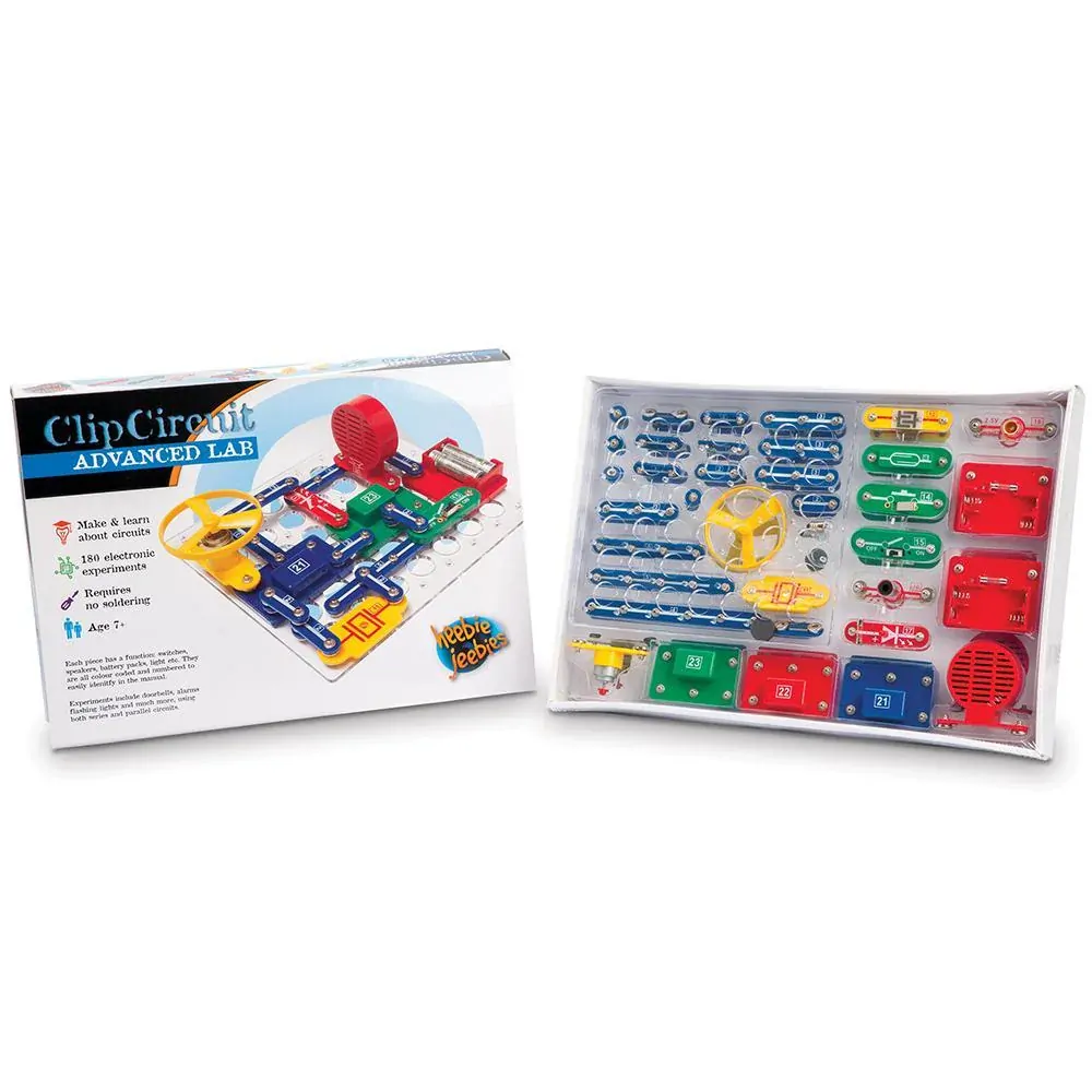 The Clip Circuit Advanced Lab is the largest of the Clip Circuit range. This electro lab contains with enough clip together parts to create 180 different working circuits. Let your girl or boy get hands on with electricity safely by joining together the colour coded parts to create flashing lights, doorbells, and flashing lights.