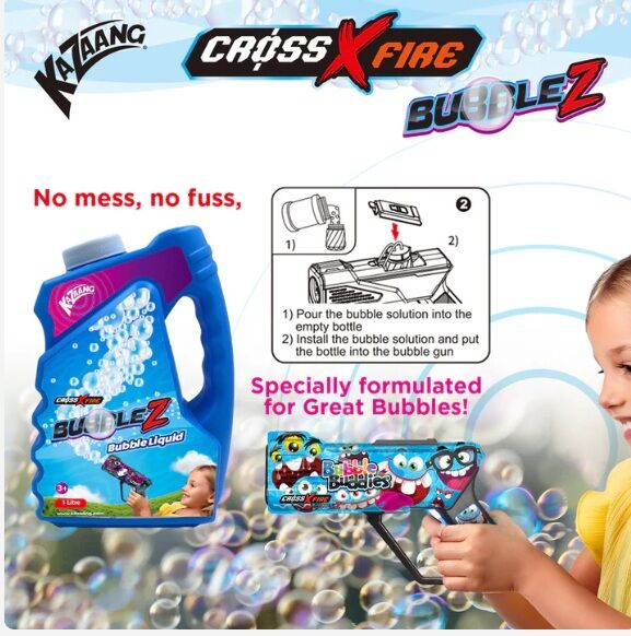 Get ready for non-stop bubbly fun with Kazaang BubbleZ Bubble Liquid! Specially formulated for maximum bubble output, this 1-litre refill is perfect for powering up your Cross X Fire BubbleZ blasters and keeping the fun going all day long.