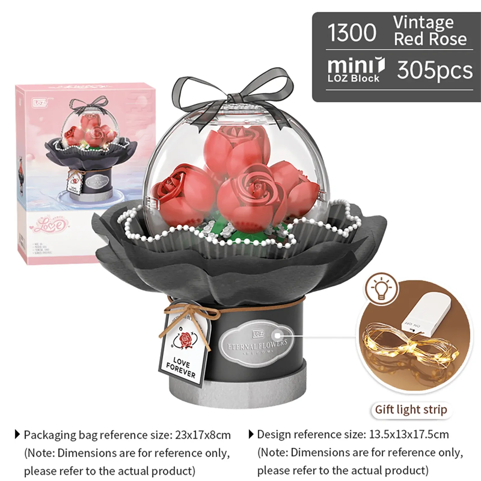The LOZ Eternal Flowers - Vintage Red Rose set is perfect for those who appreciate classic elegance and wish to create a lasting display of timeless beauty. The deep red roses, combined with the sophisticated black and grey wrapping, make this set an ideal gift for special occasions or as a chic addition to any room, bringing a touch of vintage romance to your space.