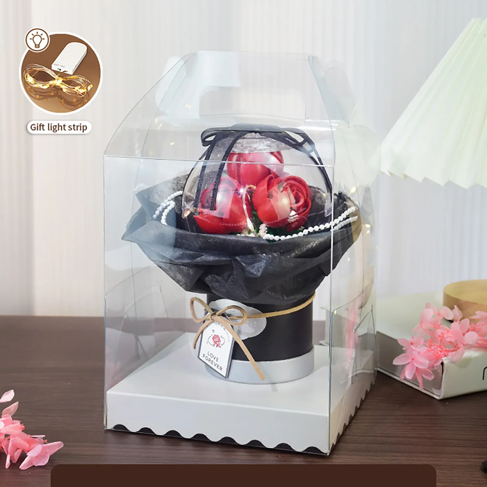 • Design: This set features a striking arrangement of deep red roses enclosed in a transparent dome, creating a preserved, timeless look. The roses are placed in a black and grey base, wrapped in black fabric with pearl accents, giving the arrangement a sophisticated and elegant appearance.