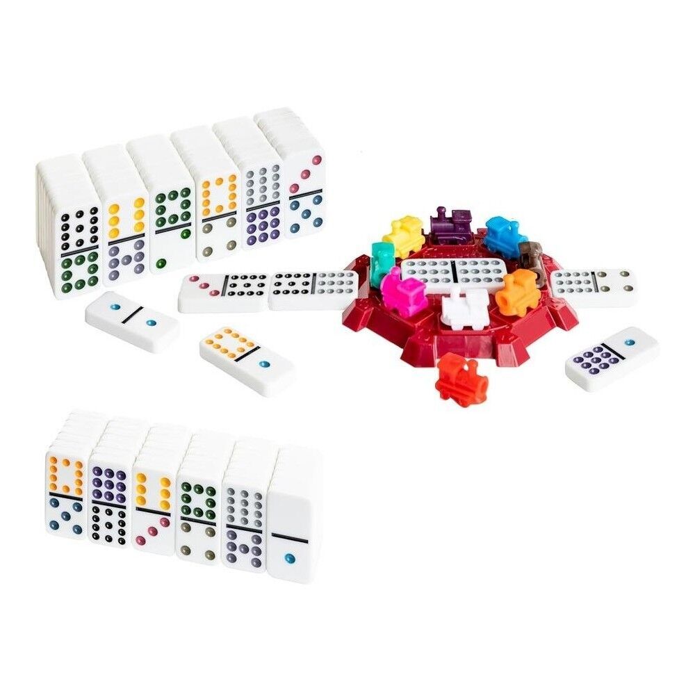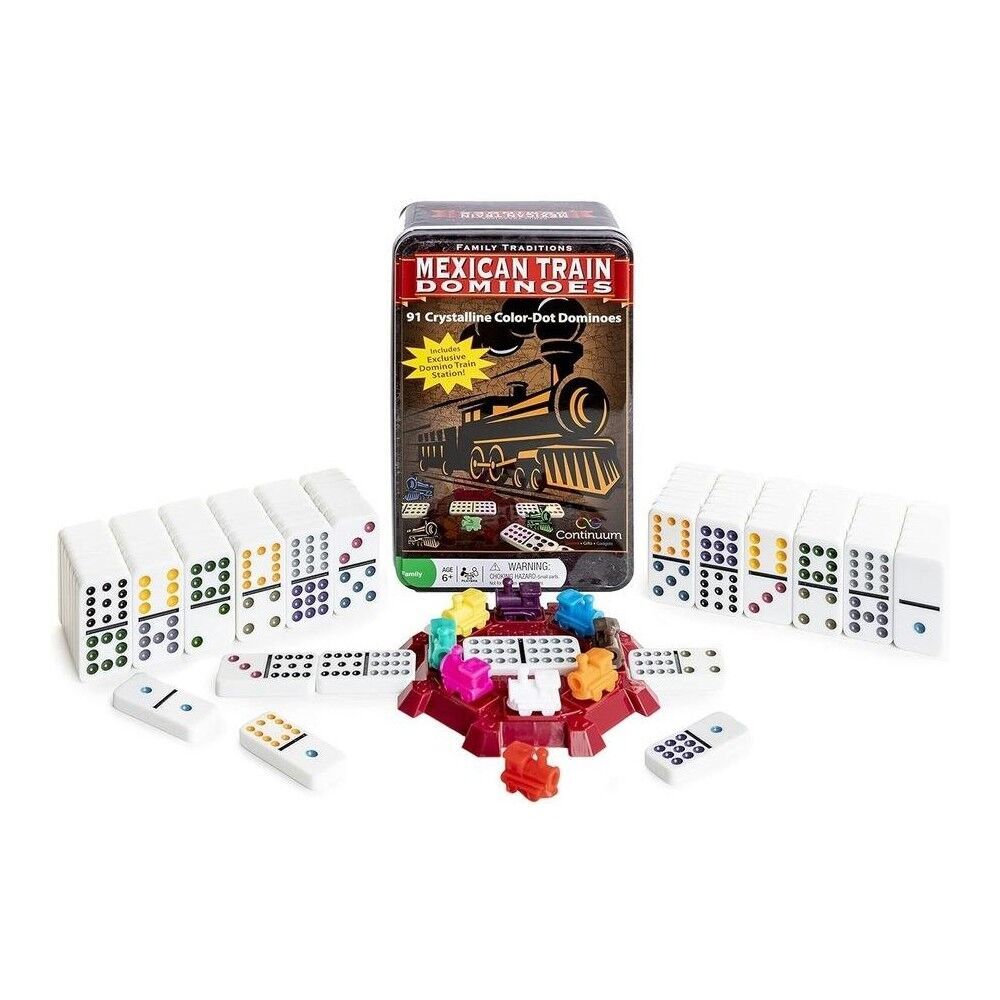 Mexican Train Dominoes is a popular game where players work to dispense all the dominoes in their hand by playing them onto one or more “trains” emanating from a central hub. The Mexican Train Dominoes Family Traditions Tin contains 91 crystalline dominos, plastic trains and train hub.