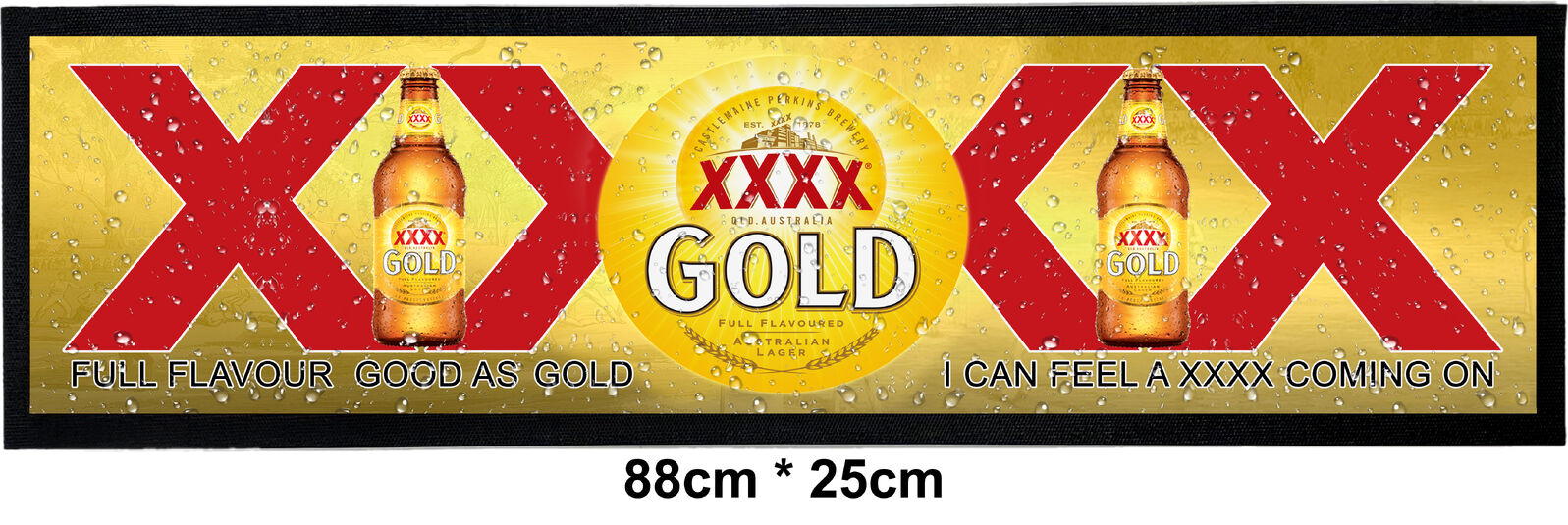 AUSTRALIAN MADE BAR MAT, FOUR X DESIGN. BAR MAT SIZE - L- 88cm x W- 25mm FULL RUBBER BACKED WITH 2cm EDGE - FELT CENTRE. SUPPLIED WIHT HANGING DISPLAY CLIP.