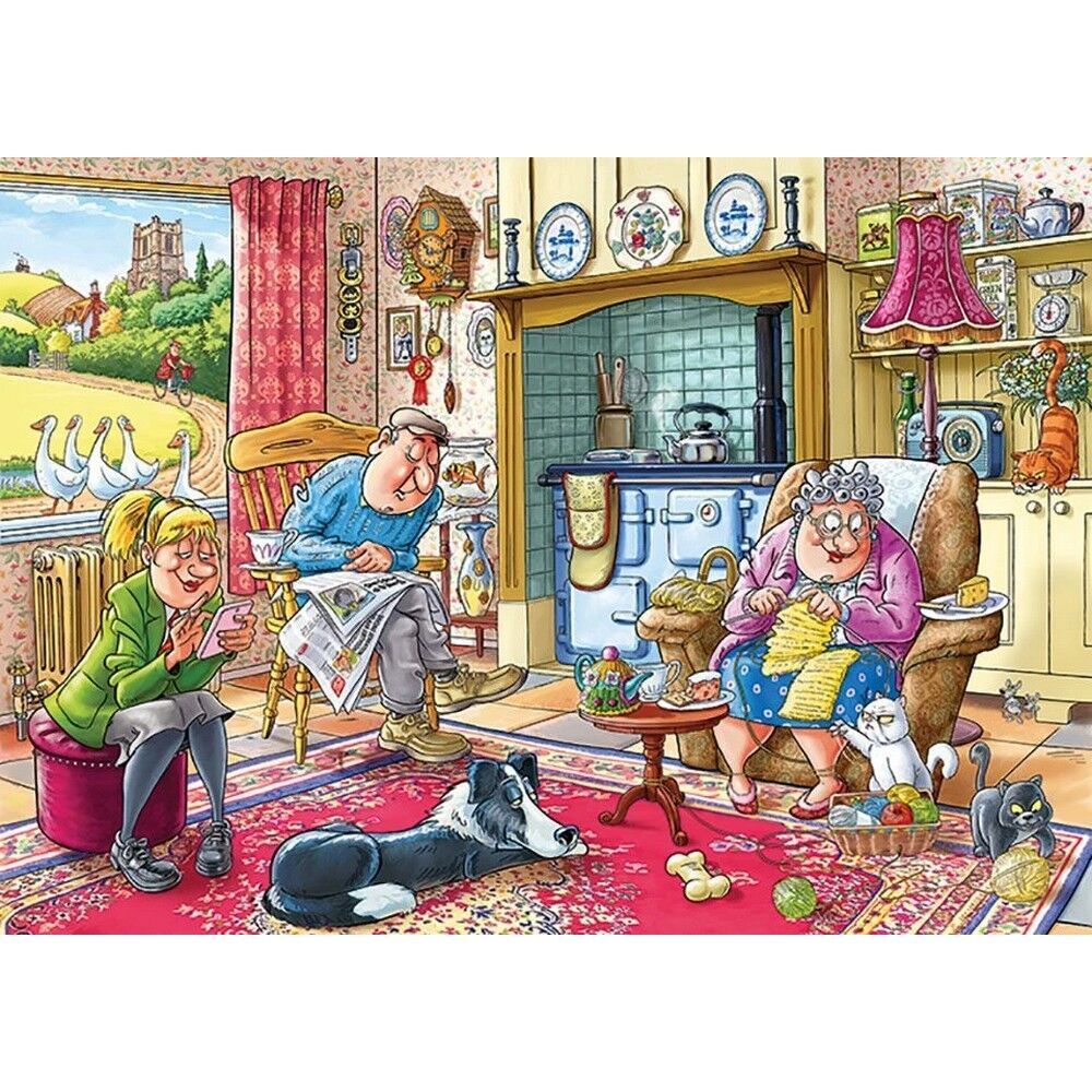 Granddad is having his afternoon nap, Granny is knitting something colourful, their granddaughter is texting her friends - wishing she was with them, and the pets are quietly minding their own business for once! But what could disturb this peace in The house? Use your imagination, and the clues provided on the box, to piece together what will happen next? This is the scene you will have to puzzle.