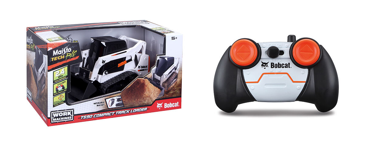 Radio controlled Work Machines from world famous brands. The Bobcat T590 Compact Track Loader features functional, manual arms and bucket. Working treads allow it to do 360º spins and climb up 30º angles. Approximately 7" Long 2.4 GHz - Up to 4 Players 115 ft. (35 Meter) Control Range Gamer Controller Vehicle uses 4 AAA Batteries (not included) Controller uses 2 AAA Batteries (not Included)