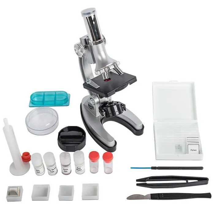 This stylish microscope comes with a sturdy carry case and everything you need to start your discovery of the microscopic world! This 28 piece kit includes 5 prepared slides, 7 blank slides, brine, dye, a petri dish and more!