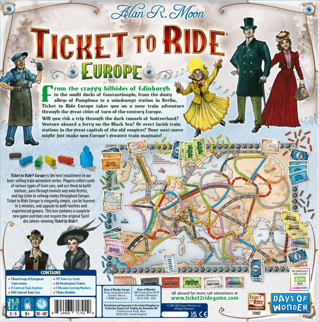 Ticket to Ride: Europe takes you on a new train adventure across Europe. From Edinburgh to Constantinople and from Lisbon to Moscow, you'll visit great cities of turn-of-the-century Europe. Like the original Ticket to Ride, the game remains elegantly simple, can be learned in 5 minutes, and appeals to both families and experienced gamers. Ticket to Ride: Europe is a complete, new game and does not require the original version.