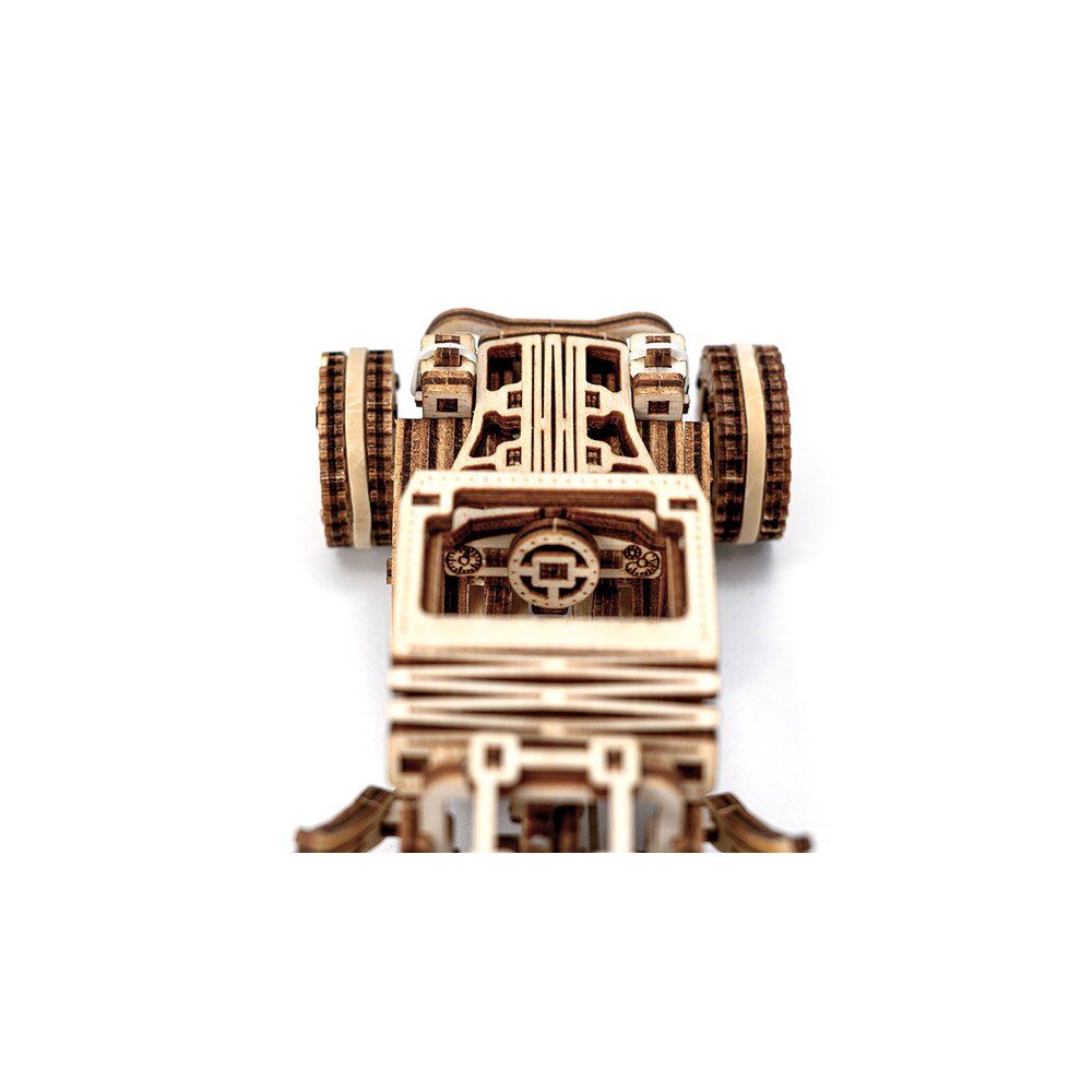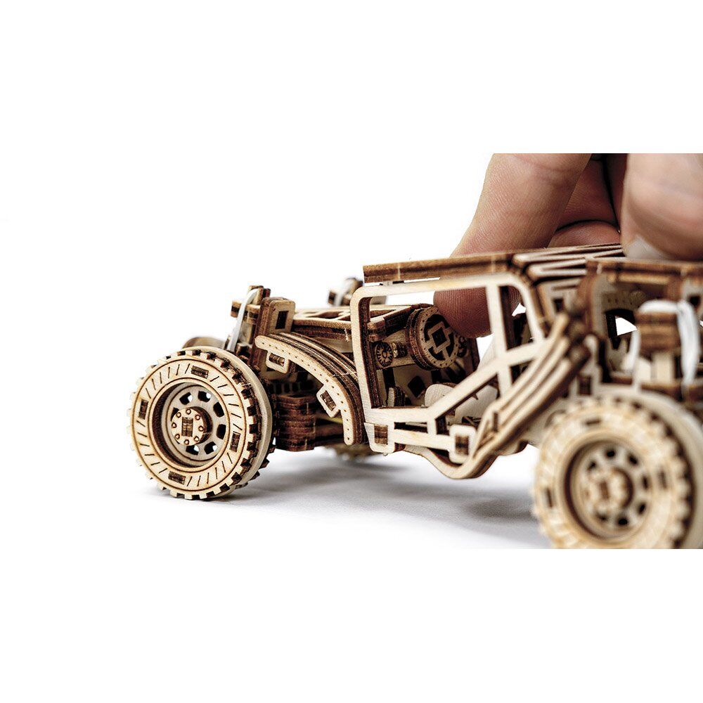 The buggy is a mechanical pleasure that goes beyond the ordinary. It's not just a static model, it's a dynamic car that moves. The buggy is powered by a rubber band motor and can drive about 1 meter forward and backward. The retraction mechanism ensures that your own creation is brought to life.