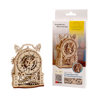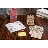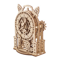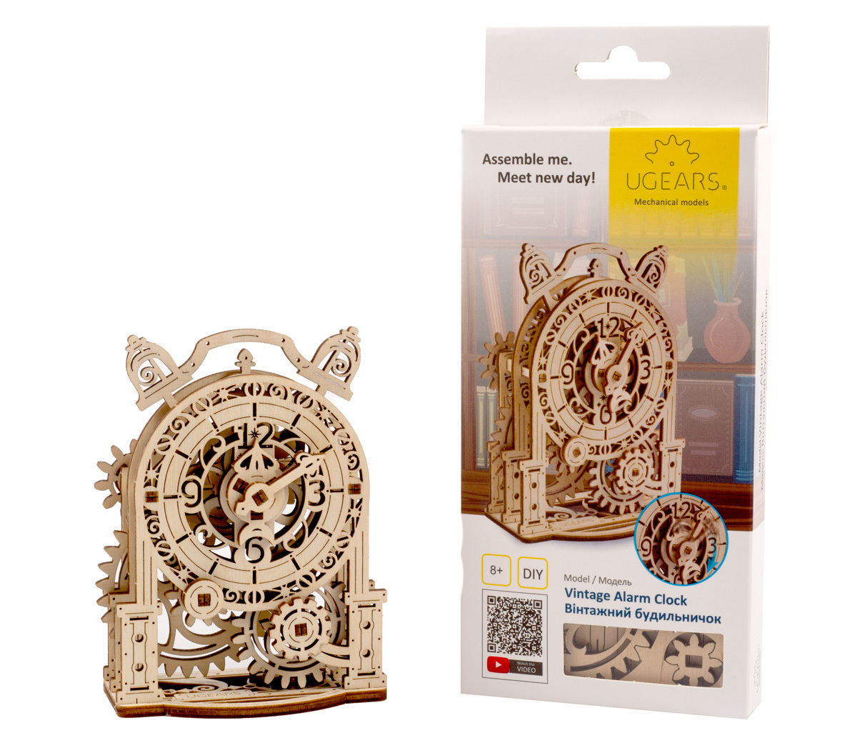 The Vintage Alarm Clock is a complement and companion piece to the Steampunk Clock in the Ugears catalogue. Both feature an openwork style of decorative carving and gearing, blending steampunk style with a slight tinge of Venetian appeal. Both models are rated "Easy" for beginners or junior builders, and both deliver a big decorative payoff and will harmonize perfectly together on your shelf or table. No glue or special tools are required to assemble this DIY clock model, just punch the pre-cut pieces out of their composite wood boards and snap them together, with a bit of sanding and waxing to make the gears run smoothly.