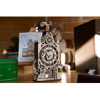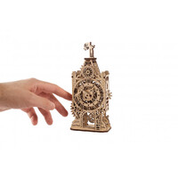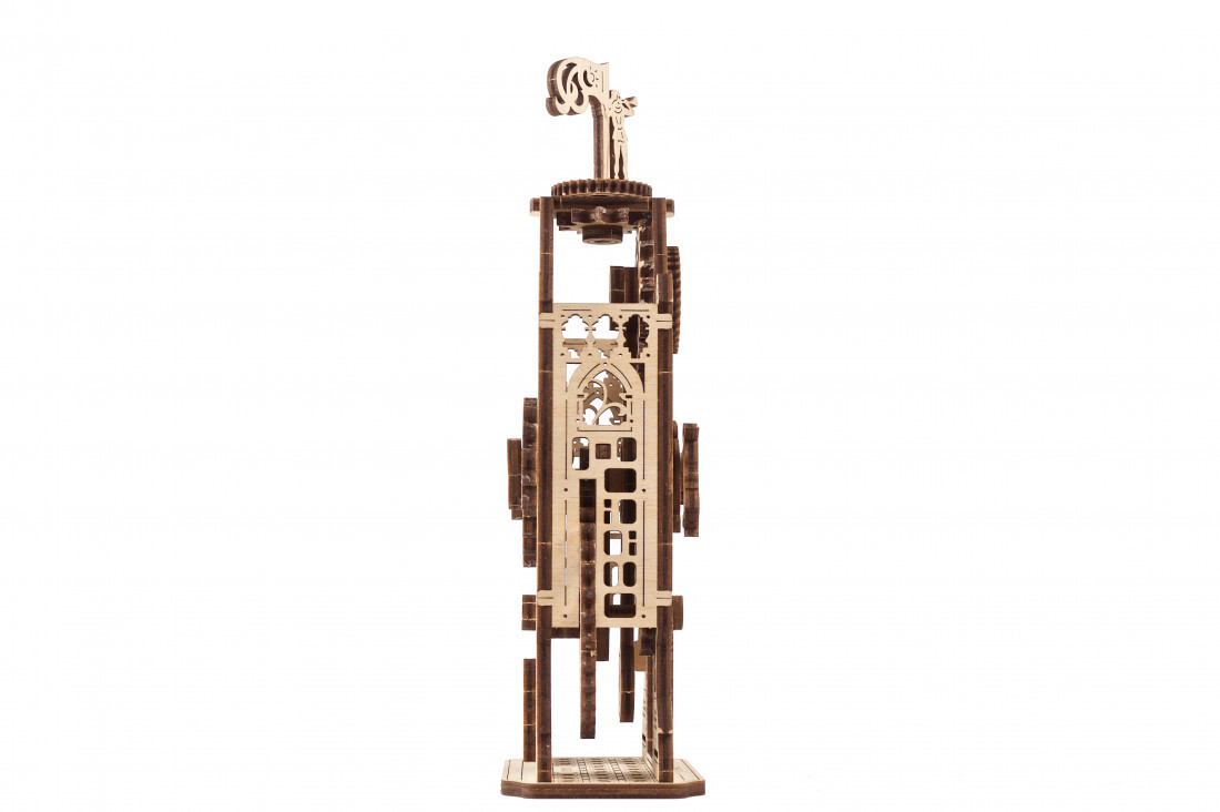 The Old Clock Tower mini-model by Ugears brings a charming medieval atmosphere into your home or office. This beautiful DIY wooden clock tower model is a mechanical mechanism in the form of a tower with clock face, moving gears, a moving pendulum, whimsical characters, and a weather vane on top. Scroll the large gear to set the hands of the clock, the pendulum, and the weather vane in motion. The weather vane is a trumpeter holding on to a banner blowing in the wind. For comic effect, a man is suspended from the clock’s spinning minute hand, holding on for dear life. Another man climbs a ladder below the clock—perhaps a cleaner or clock repairman? Behind the clock a suspicious-looking figure enters a hidden door—a thief storing his loot in the clock tower, or maybe a hunchback, bringing his lunch back? Invent your own story as you spin the gears and watch the mechanism come to life.