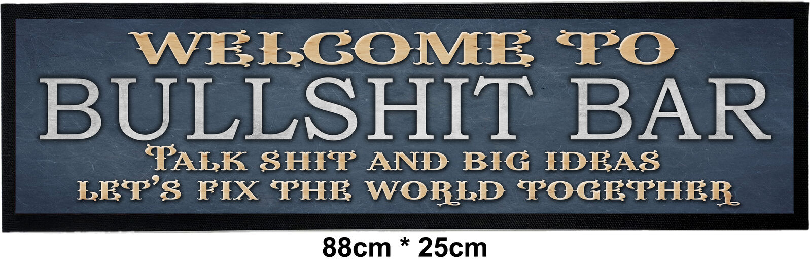 WELCOME TO THE BS BAR – BAR MAT Proudly Australian made, this fun and cheeky bar mat sets the perfect tone for any home bar, man cave, shed, or pub space – the place where tall tales meet big ideas. Measuring 88cm (L) x 25cm (W), it has a durable full rubber backing with a 2cm border and a soft felt center—perfect for protecting bar surfaces while making a visual impact. Each mat is supplied with a hanging display clip for easy retail presentation.